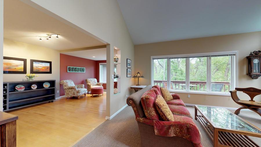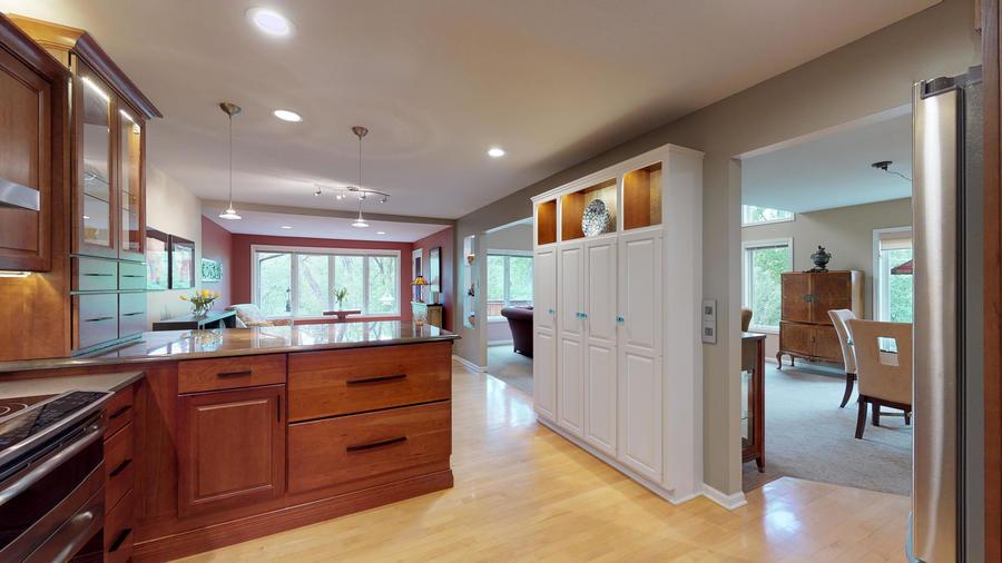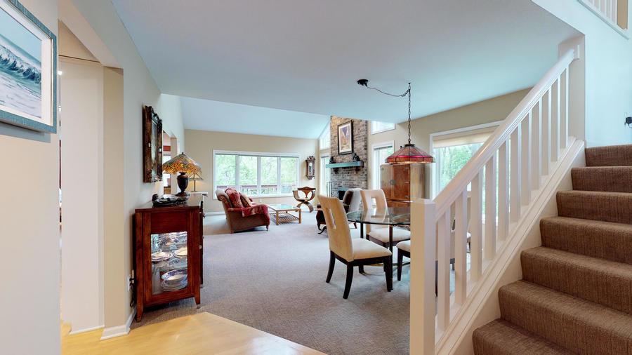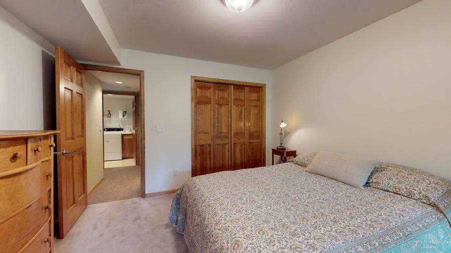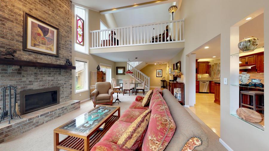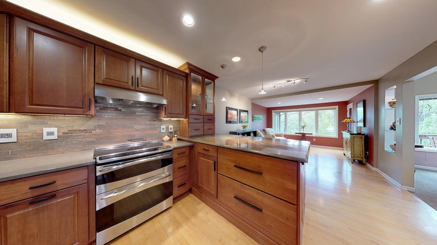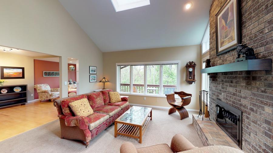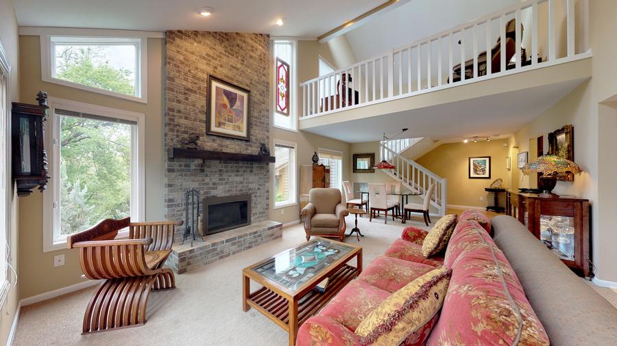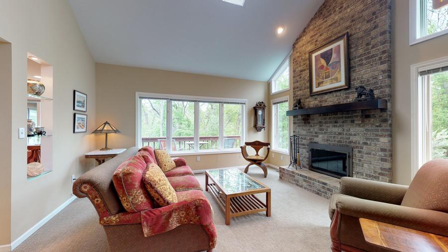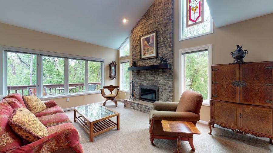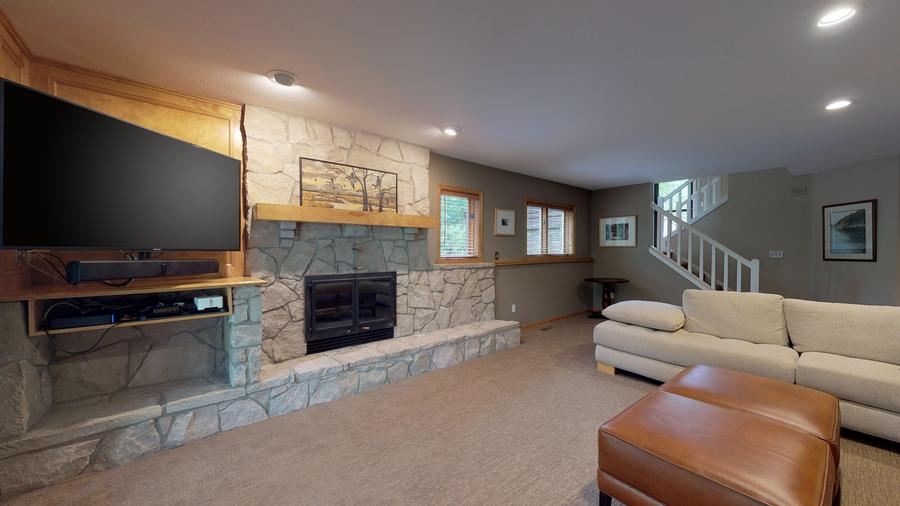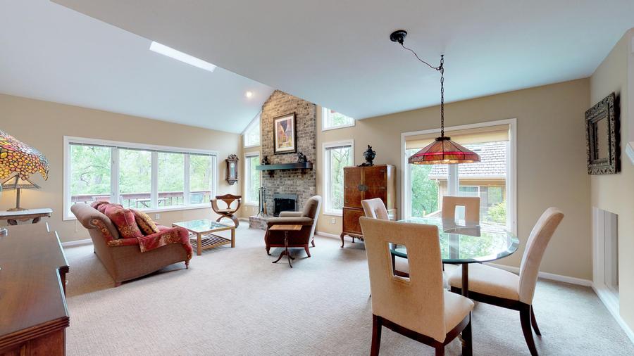 The main floor flows from the entry to a showcase kitchen w/ Cherry cabinets w/pullout drawers, Copper Dune quartzite peninsula w/Swarovski pendant light, tile and glass backsplash, LG French door fridge, double oven and 2 pantries. The expansive owners suite has a deck, skylight, walk-in closet and loft as well as a remodeled 3/4 bath with custom vanity w/honed marble counter, double sinks, pull out drawers w/ power strips, ceramic tile shower w/ extra tall inset niche and frameless glass door. Maple hardwood floors, 2 fireplaces, cedar shake roof, Leaf Guard gutters. This 16 unit community has a monthly fee of $235 & includes: lawn care & snow removal, lights & water for common areas, trash & recycle, & exterior window washing twice/year. (Roof, siding, windows, and insurance are NOT included in the fee.) Pets are ok! View the Matterport Virtual Tour
