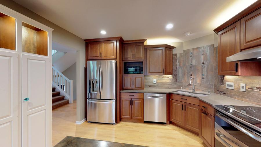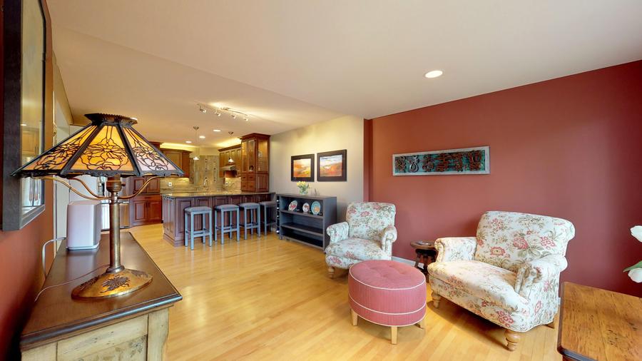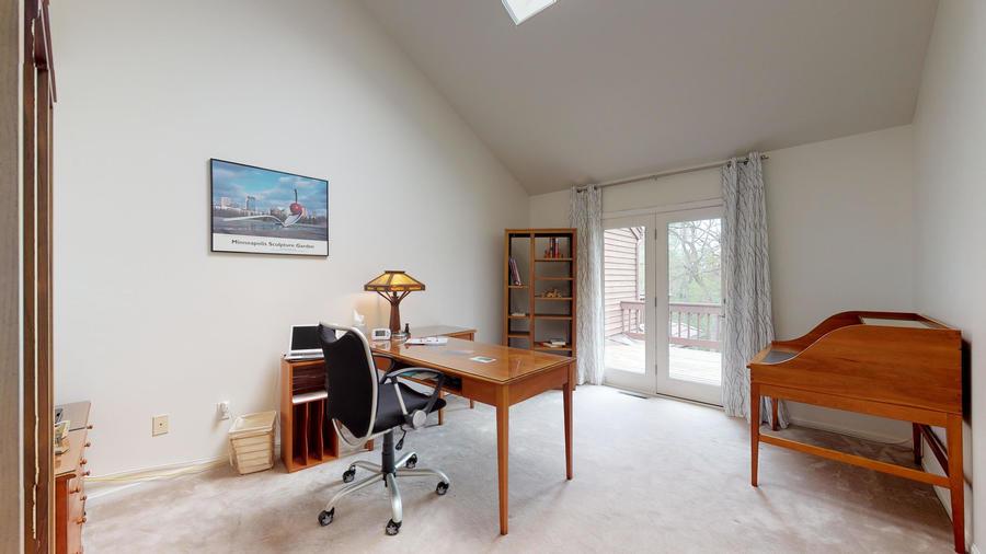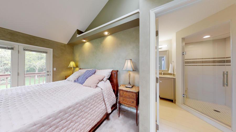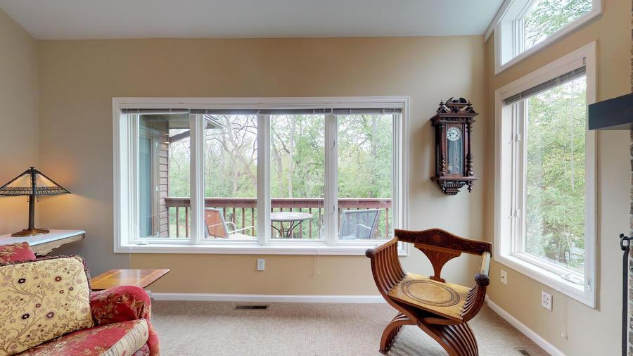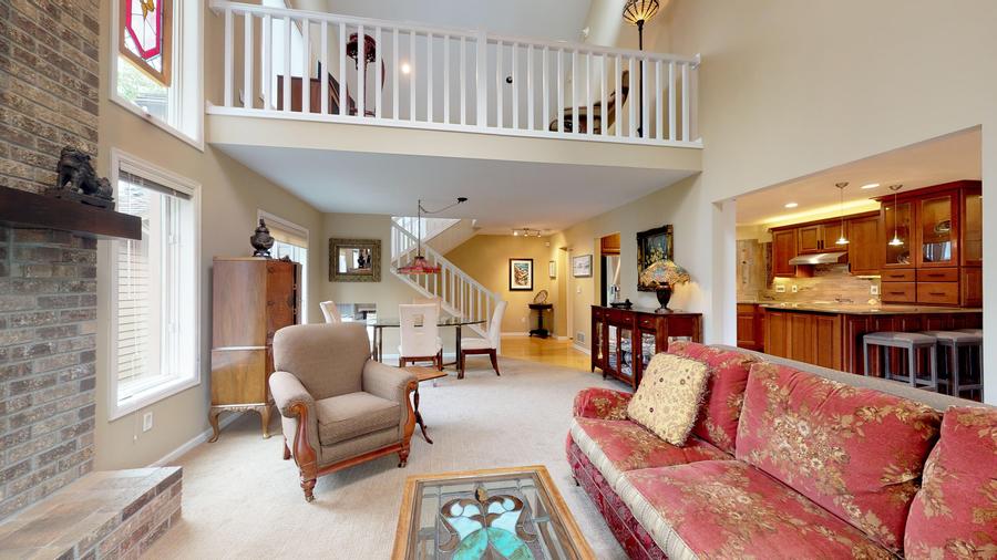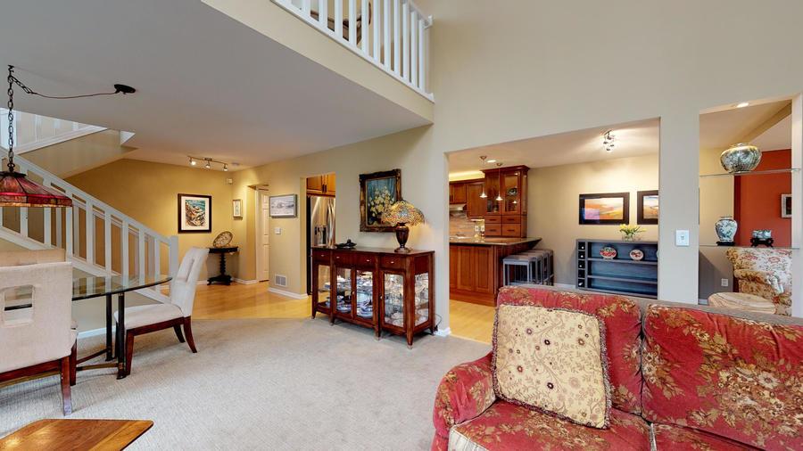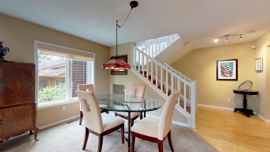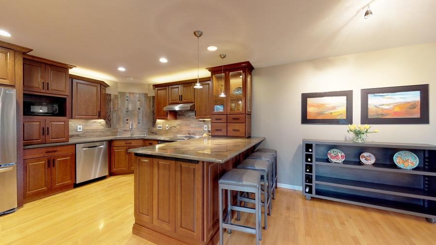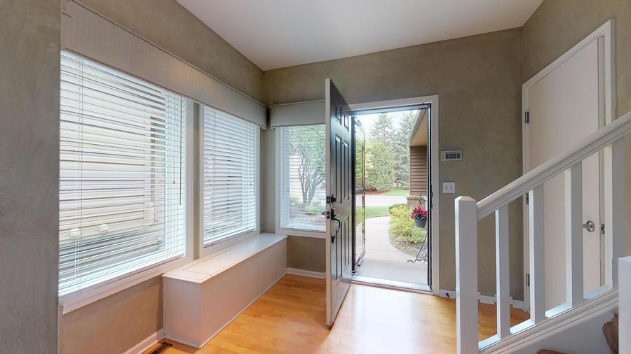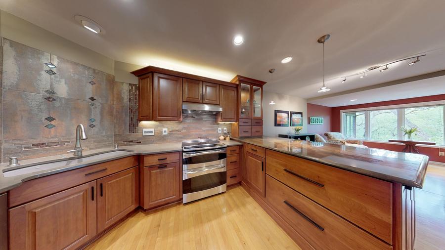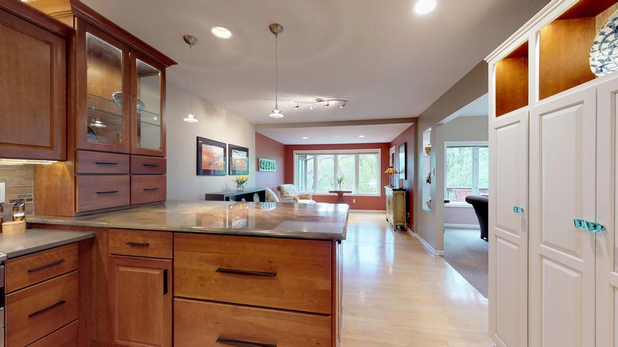 The main floor flows from the entry to a showcase kitchen w/ Cherry cabinets w/pullout drawers, Copper Dune quartzite peninsula w/Swarovski pendant light, tile and glass backsplash, LG French door fridge, double oven and 2 pantries. The expansive owners suite has a deck, skylight, walk-in closet and loft as well as a remodeled 3/4 bath with custom vanity w/honed marble counter, double sinks, pull out drawers w/ power strips, ceramic tile shower w/ extra tall inset niche and frameless glass door. Maple hardwood floors, 2 fireplaces, cedar shake roof, Leaf Guard gutters. This 16 unit community has a monthly fee of $235 & includes: lawn care & snow removal, lights & water for common areas, trash & recycle, & exterior window washing twice/year. (Roof, siding, windows, and insurance are NOT included in the fee.) Pets are ok! View the Matterport Virtual Tour