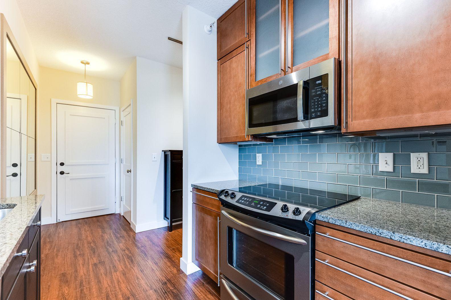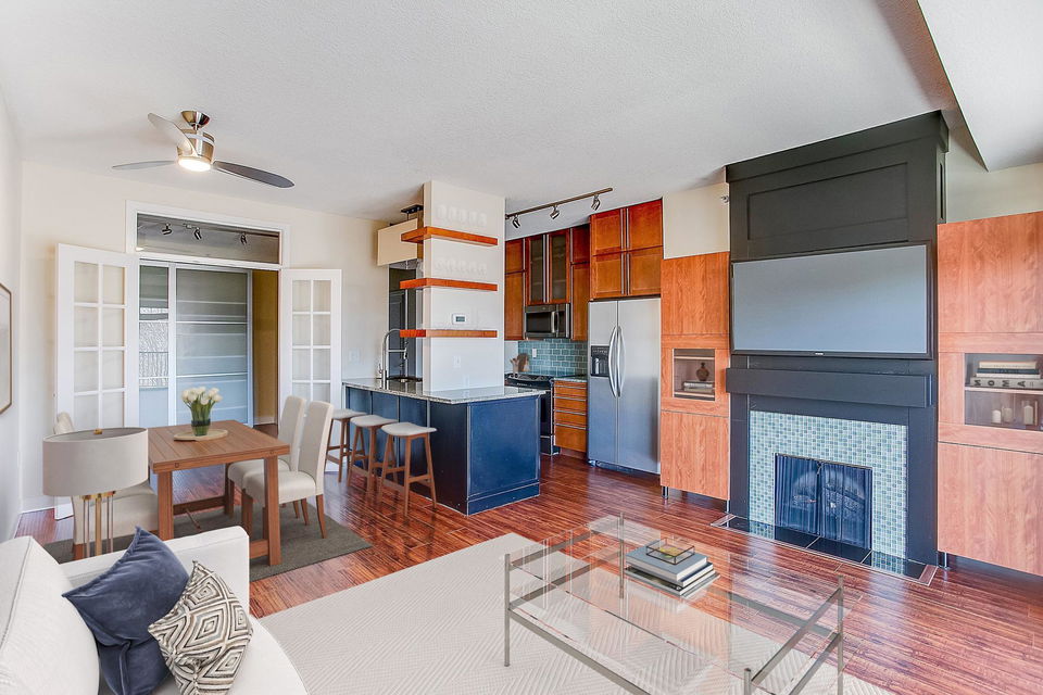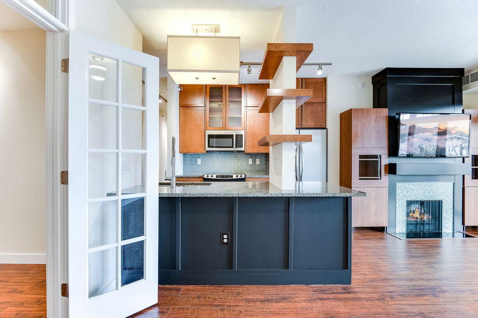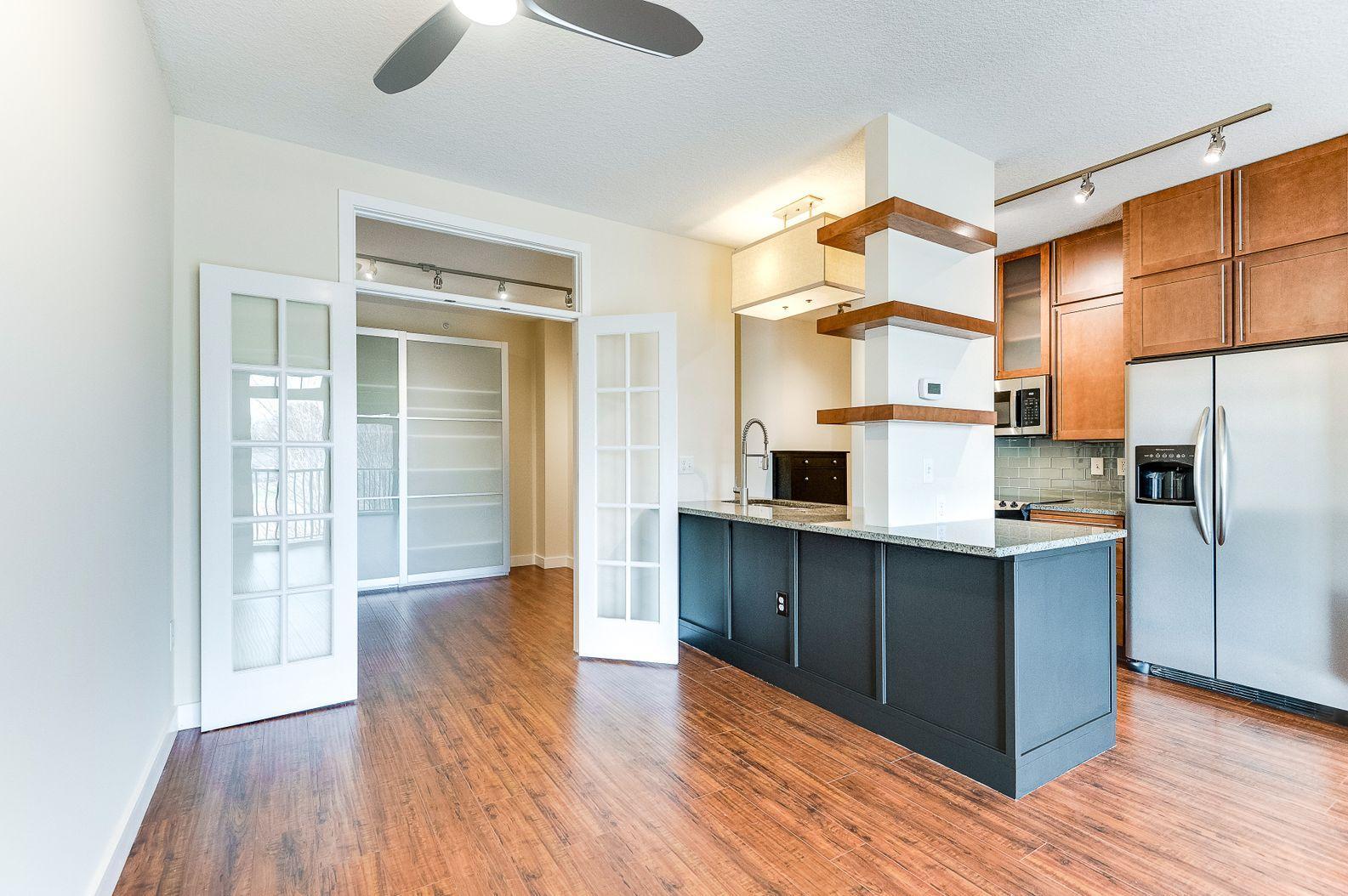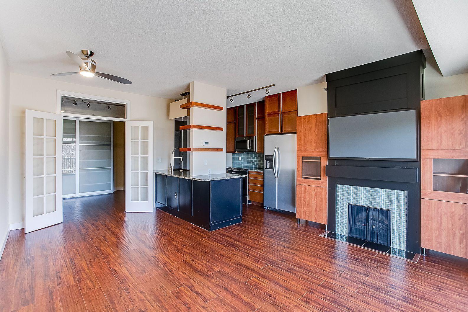 Inviting and stylish open floor plan offers today’s desired condo lifestyle! Eastern exposure lets in morning sunrises over the ballfield! For your two-bedroom condo folks, this one bedroom plus den with French doors and Ikea wall unit is great for extra space…office, den, or guest room! TURN-KEY condition with good storage, spacious owner’s bedroom with walk-in-closet, amazing 3/4 marble/tiled bathroom, and in-unit laundry! Abundant cabinet and counter-space with breakfast/entertainment bar to scoot up to! Stainless steel appliances and granite counters. Gas fireplace with built-ins, dinette space, and private balcony off living room! TWO underground parking spaces, party room, gym, and outdoor patio/grill! Awesome location!