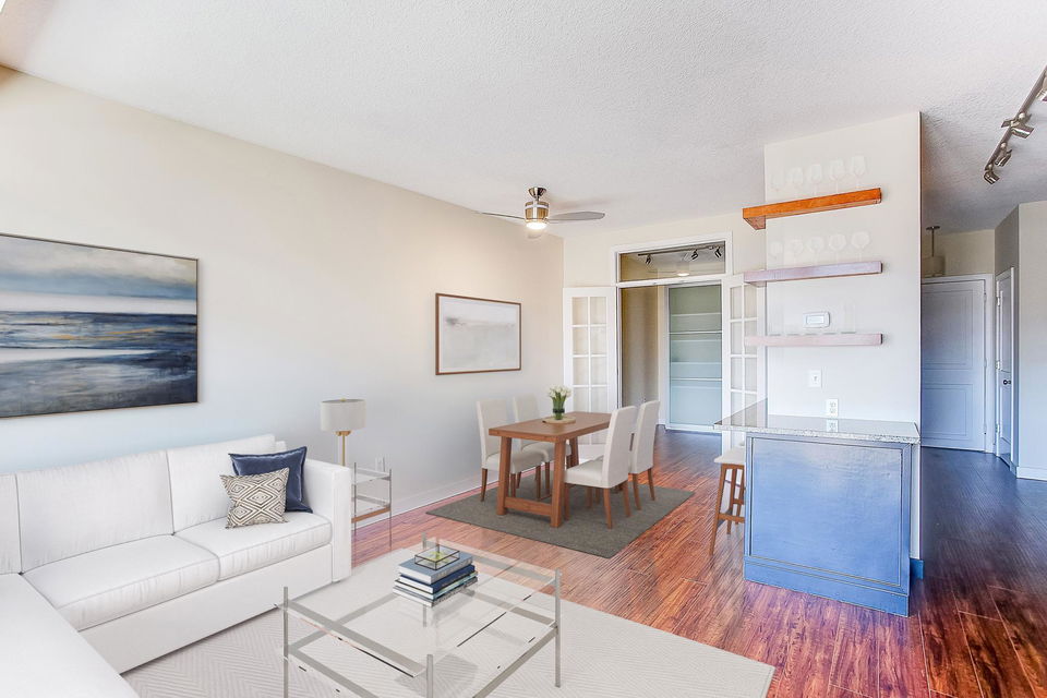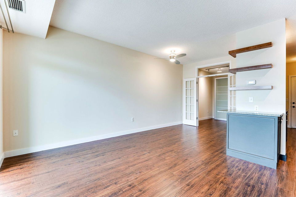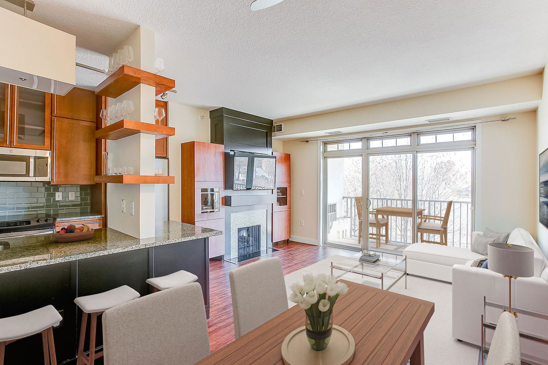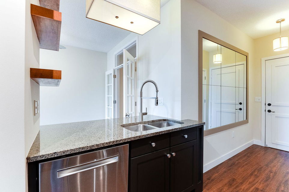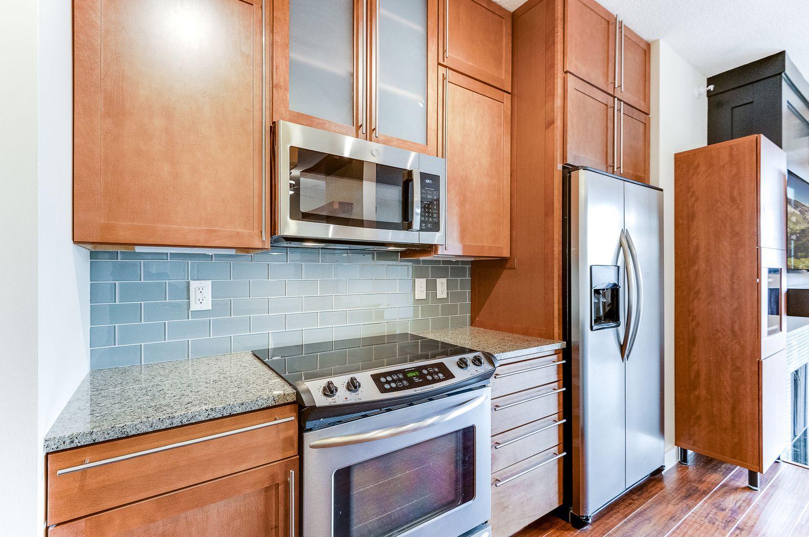 Inviting and stylish open floor plan offers today’s desired condo lifestyle! Eastern exposure lets in morning sunrises over the ballfield! For your two-bedroom condo folks, this one bedroom plus den with French doors and Ikea wall unit is great for extra space…office, den, or guest room! TURN-KEY condition with good storage, spacious owner’s bedroom with walk-in-closet, amazing 3/4 marble/tiled bathroom, and in-unit laundry! Abundant cabinet and counter-space with breakfast/entertainment bar to scoot up to! Stainless steel appliances and granite counters. Gas fireplace with built-ins, dinette space, and private balcony off living room! TWO underground parking spaces, party room, gym, and outdoor patio/grill! Awesome location!