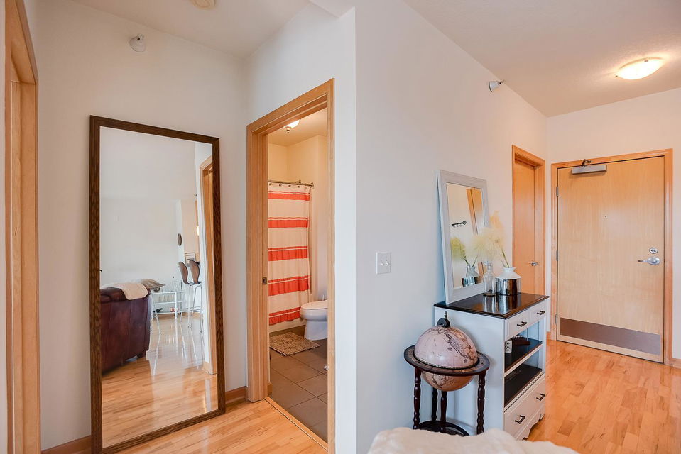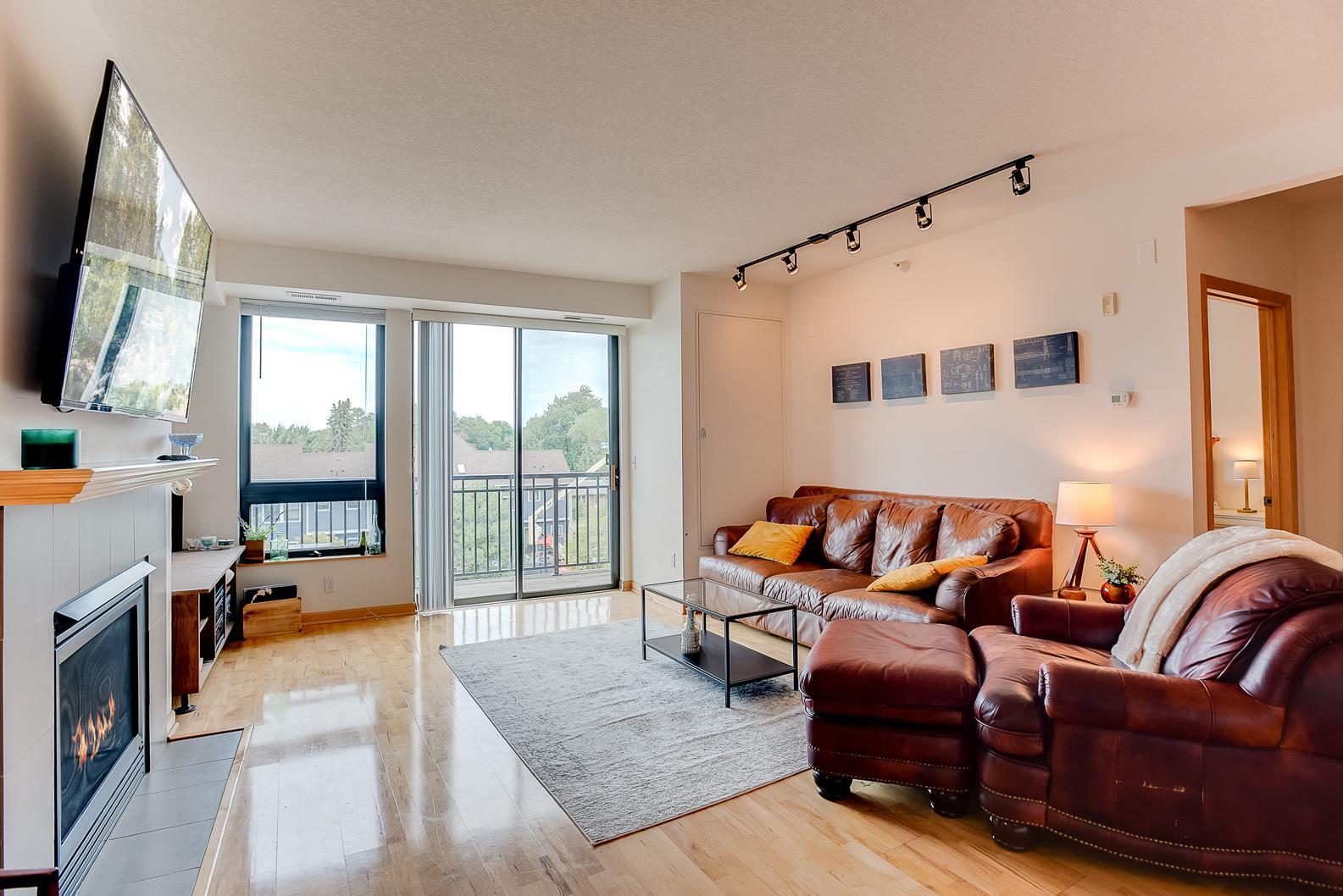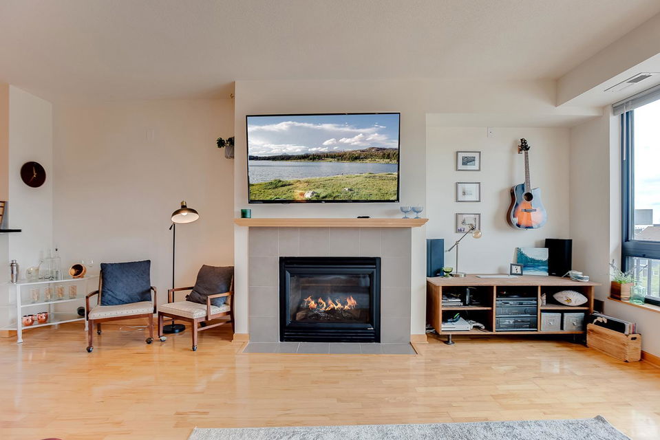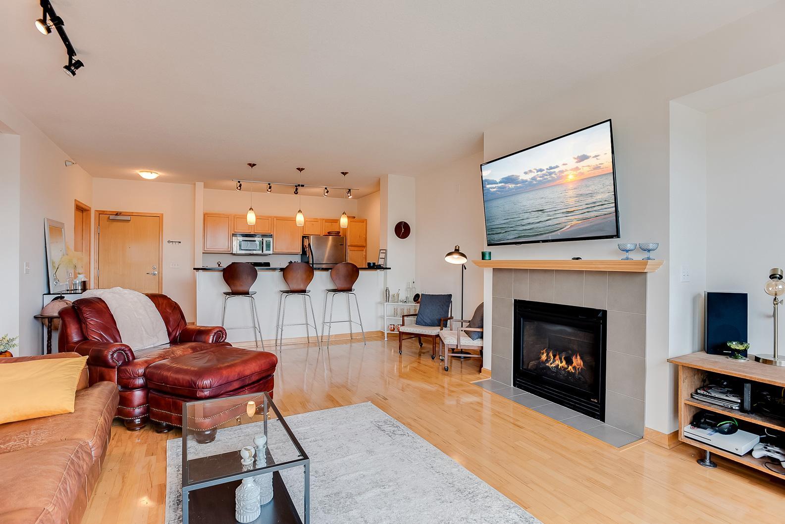 hardwood floors! Enjoy the west facing balcony off the living room, gas fireplace and in-unit laundry.Building amenities include a party room, fitness center, underground heated garage with