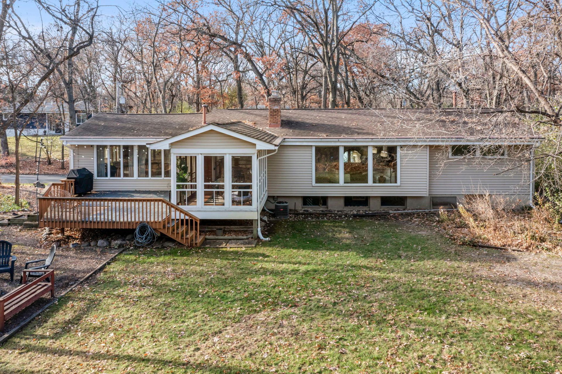 Wind your way down Lea Road…a coveted wooded road that connects to the Three River Park trails! This 3 bedroom walk-out one story is set on a .45 acre private setting surrounded by mature trees! The greenspace is perfect for gardening, place space, lounging by the fire pit, or chillin’ & grillin’ on your deck! Super cool main floor offers a vaulted living/dining room overlooking yard plus a vaulted 3 season porch off dining that connects to deck! Spacious updated kitchen with breakfast var is open to an amazing and spacious main floor family room. This also has access to the deck…so convenient! Family room is banked with windows for natural lighting and wooded views! 3 bedrooms on main level along with an updated full ceramic bath! Lower level family room and 3/4 tiled bath! Large workshop and loads of storage spaces as well! 2 car attached tuckunder garage is great for cold/rainy days! Highland Hills Ski area, Normandale Lake and Amphitheatre, and miles of trails all so close! Pickleball courts/park just blocks away and restaurants and shopping! Come visit and fall in love with 8125 Lea Rd and this most amazing secret wooded oasis!